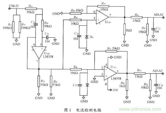 電池充放電電流的大小尤為關(guān)鍵。電路圖如圖1所示,因?yàn)槭羌葯z測(cè)充電電流也檢測(cè)放電電流,故在小電阻上的電壓又是兩個(gè)方向,在電路檢測(cè)中用兩個(gè)通道分別檢測(cè),這樣也便于分別進(jìn)行信號(hào)的調(diào)理,同時(shí)也便于用A/D轉(zhuǎn)換器的一個(gè)輸入通道來測(cè)量。