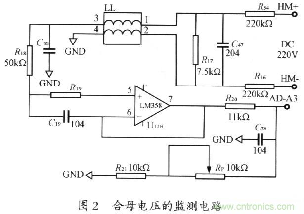 合母電壓監(jiān)測(cè)電路如圖2所示。合母電壓流過電阻R16、R17、R54,在電阻R17上取樣,故而電阻R17應(yīng)選用高精度電阻。R16和R54因?yàn)橐入娮鑂17大得多,又是出現(xiàn)在分母上,故而不必選用高精度電阻。LL的作用是抑制共模干擾??梢酝ㄟ^調(diào)節(jié)電位器Rp的大小來使所要監(jiān)測(cè)電壓的大小符合A/D轉(zhuǎn)換器輸入電壓要求。
