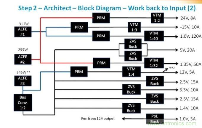 構(gòu)建系統(tǒng)的第一個(gè)步驟是創(chuàng)建一個(gè)電源系統(tǒng)的方框圖,從輸出開(kāi)始,然后向輸入后向推進(jìn)。從最低功率級(jí)別開(kāi)始它的運(yùn)作更好,并從那里繼續(xù)工作,以便可以審查功率元件類別,并隨功率級(jí)別的增加在必要時(shí)做出改變。