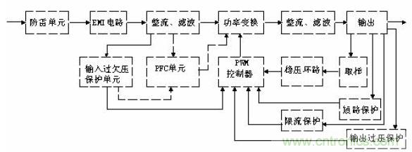 開關(guān)電源的主要電路是由輸入電磁干擾濾波器(EMI)、整流濾波電路、功率變換電路、PWM控制器電路、輸出整流濾波電路組成。輔助電路有輸入過欠壓保護電路、輸出過欠壓保護電路、輸出過流保護電路、輸出短路保護電路等。開關(guān)電源的電路組成方框圖如下: