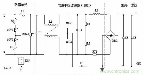 ① 防雷電路:當有雷擊,產(chǎn)生高壓經(jīng)電網(wǎng)導入電源時,由MOV1、MOV2、MOV3:F1、F2、F3、FDG1組成的電路進行保護。當加在壓敏電阻兩端的電壓超過其工作電壓時,其阻值降低,使高壓能量消耗在壓敏電阻上,若電流過大,F(xiàn)1、F2、F3會燒毀保護后級電路。