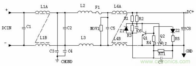 ② R1、R2、R3、Z1、C6、Q1、Z2、R4、R5、Q2、RT1、C7組成抗浪涌電路。在起機的瞬間,由于C6的存在Q2不導通,電流經(jīng)RT1構(gòu)成回路。當C6上的電壓充至Z1的穩(wěn)壓值時Q2導通。如果C8漏電或后級電路短路現(xiàn)象,在起機的瞬間電流在RT1上產(chǎn)生的壓降增大,Q1導通使Q2沒有柵極電壓不導通,RT1將會在很短的時間燒毀,以保護后級電路。