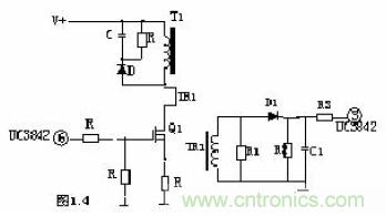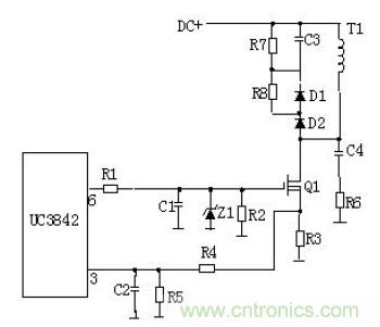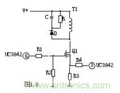 R4、C3、R5、R6、C4、D1、D2組成緩沖器,和開關(guān)MOS管并接,使開關(guān)管電壓應力減少,EMI減少,不發(fā)生二次擊穿。在開關(guān)管Q1關(guān)斷時,變壓器的原邊線圈易產(chǎn)生尖峰電壓和尖峰電流,這些元件組合一起,能很好地吸收尖峰電壓和電流。從R3測得的電流峰值信號參與當前工作周波的占空比控制,因此是當前工作周波的電流限制。當R5上的電壓達到1V時,UC3842停止工作,開關(guān)管Q1立即關(guān)斷。