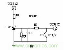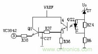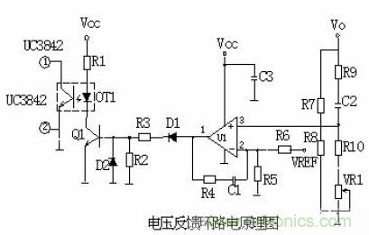 當輸出U0升高,經(jīng)取樣電阻R7、R8、R10、VR1分壓后,U1③腳電壓升高,當其超過U1②腳基準電壓后U1①腳輸出高電平,使Q1導通,光耦OT1發(fā)光二極管發(fā)光,光電三極管導通,UC3842①腳電位相應變低,從而改變U1⑥腳輸出占空比減小,U0降低。