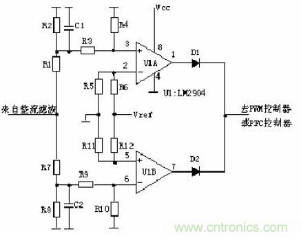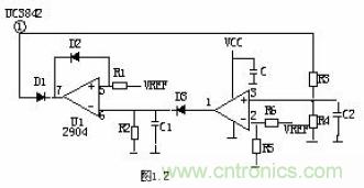 取樣電壓分為兩路,一路經(jīng)R1、R2、R3、R4分壓后輸入比較器3腳,如取樣電壓高于2腳基準電壓,比較器1腳輸出高電平去控制主控制器使其關(guān)斷,電源無輸出。另一路經(jīng)R7、R8、R9、R10分壓后輸入比較器6腳,如取樣電壓低于5腳基準電壓,比較器7腳輸出高電平去控制主控制器使其關(guān)斷,電源無輸出。