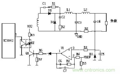 當輸出U0降低時,U1③腳電壓降低,當其低過U1②腳基準電壓后U1①腳輸出低電平,Q1不導通,光耦OT1發(fā)光二極管不發(fā)光,光電三極管不導通,UC3842①腳電位升高,從而改變U1⑥腳輸出占空比增大,U0降低。周而復始,從而使輸出電壓保持穩(wěn)定。調(diào)節(jié)VR1可改變輸出電壓值。