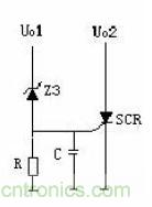 如上圖,當Uo1輸出升高,穩(wěn)壓管(Z3)擊穿導通,可控硅(SCR1)的控制端得到觸發(fā)電壓,因此可控硅導通。Uo2電壓對地短路,過流保護電路或短路保護電路就會工作,停止整個電源電路的工作。當輸出過壓現(xiàn)象排除,可控硅的控制端觸發(fā)電壓通過R對地泄放,可控硅恢復斷開狀態(tài)。