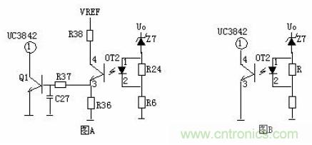圖A的工作原理是,當輸出電壓Uo升高,穩(wěn)壓管導通,光耦導通,Q2基極得電導通,由于Q2的導通Q1基極電壓降低也導通,Vcc電壓經(jīng)R1、Q1、R2使Q2始終導通,UC3842③腳始終是高電平而停止工作。在圖B中,UO升高U1③腳電壓升高,①腳輸出高電平,由于D1、R1的存在,U1①腳始終輸出高電平Q1始終導通,UC3842①腳始終是低電平而停止工作。正反饋?