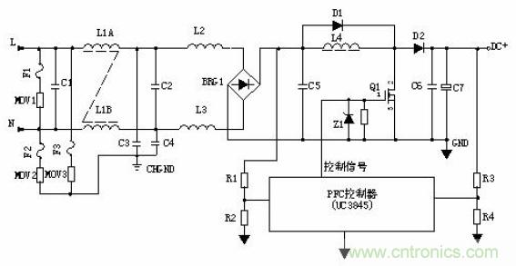 輸入電壓經(jīng)L1、L2、L3等組成的EMI濾波器,BRG1整流一路送PFC電感,另一路經(jīng)R1、R2分壓后送入PFC控制器作為輸入電壓的取樣,用以調(diào)整控制信號的占空比,即改變Q1的導通和關(guān)斷時間,穩(wěn)定PFC輸出電壓。L4是PFC電感,它在Q1導通時儲存能量,在