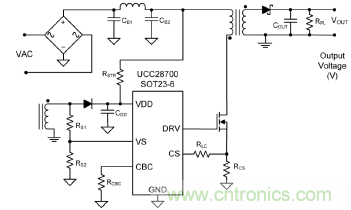 UCC28700是一款恒壓、恒流反激式控制器,無需使用光耦合器便可實現(xiàn)一次側(cè)穩(wěn)壓。圖1是UCC28700的應(yīng)用電路。