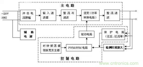 開關(guān)電源大至由主電路、控制電路、檢測(cè)電路、輔助電源四大部份組成,見圖1。