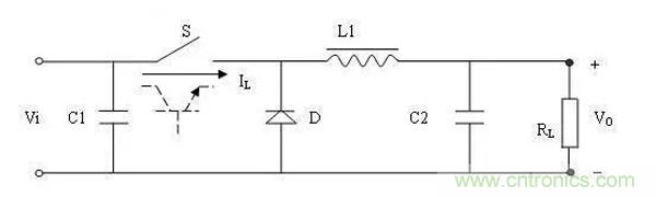 開關(guān)電源就是采用功率半導(dǎo)體器件作為開關(guān)元件,通過周期性通斷開關(guān),控制開關(guān)元件的占空比來調(diào)整輸出電壓。開關(guān)元件以一定的時(shí)間間隔重復(fù)地接通和斷開,在開關(guān)無件接通時(shí)輸入電源Vi通過開關(guān)S和濾波電路向負(fù)載RL提供能量,當(dāng)開關(guān)S斷開時(shí),電路中的儲(chǔ)能裝置(L1、C2、二極管D組成的電路)向負(fù)載RL釋放在開關(guān)接通時(shí)所儲(chǔ)存的能量,使負(fù)載得到連續(xù)而穩(wěn)定的能量。