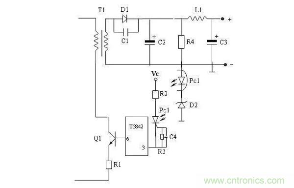 經(jīng)檢查此開關(guān)電源采用U3842 PWM控制芯片,經(jīng)查找相關(guān)的資料得知,當(dāng)U3842芯片的3端電壓高于1伏時(shí),內(nèi)部電流敏感比較器輸出高電平,將PWM鎖存器復(fù)位使輸出關(guān)閉。通電測(cè)量U3842的3端高于1伏,6端無輸出,經(jīng)檢查相關(guān)電路,發(fā)現(xiàn)穩(wěn)壓管D2擊穿,如圖3,故PC1導(dǎo)通,致使U3842的3端為高電平,故6端無輸出,開關(guān)管不工作,直流側(cè)無直流輸出。更換同型號(hào)穩(wěn)壓管D2,故障解除。