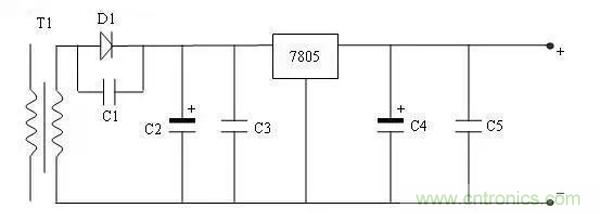 經(jīng)檢查,供光譜儀主板的直流5V電源僅剩2.3伏左右,脫開5V直流電源的負(fù)載,通電再次測(cè)量5V直流電源,這時(shí)則有5V,初步判斷此5V直流電源帶載能力差,拆開電源外殼進(jìn)行檢修,由于沒有帶負(fù)載時(shí),通電有直流5V輸出,故重點(diǎn)檢查次級(jí)線圈側(cè)的輸出整流電路,給5伏電源接上假負(fù)載通電進(jìn)行測(cè)量發(fā)現(xiàn)三通穩(wěn)壓7805的1、2腳之間電壓為5.2伏,2、3腳之間卻剩2.3伏,如圖4,故判斷三通穩(wěn)壓管7805性能變壞,更換三通穩(wěn)壓管7805故障解決。