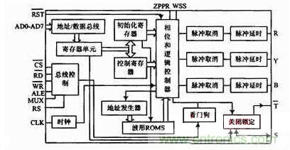 SA4828原理框圖如圖3所示。它接收并存儲微處理器初始化命令和控制命令,主要由總線控制、地址/數(shù)據(jù)總線、存儲器、控制寄存器組成,以控制字的形式實現(xiàn)。三相輸出控制電路的每相輸出控制電路由脈沖取消和脈沖延時電路構成,脈沖取消將脈沖寬度小于取消時間的脈沖去掉,延時電路保證死區(qū)間隔,以防止在轉換瞬間橋路開關器件出現(xiàn)直通現(xiàn)象。