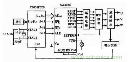 以SA4828與單片機C8051F020為核心構成的控制器電路設計如圖4所示??刂齐娐犯鶕?jù)給定的參數(shù)輸出三相SPWM信號給智能功率模塊IP-M,實現(xiàn)對功率晶體管的通斷控制。C8051F020通過8位P0端口與SA4828的地址、數(shù)據(jù)管腳AD0~AD7相連,工作時,單片機首先對SA4828進行初始化,定義載波頻率,電源頻率范圍、死區(qū)、最小脈沖取消時間等參數(shù)。然后向SA4828的控制寄存器傳送電源的頻率控制字和幅度控制字等參數(shù)。正常工作時,根據(jù)需要對SA4828的控制數(shù)據(jù)進行修改,實現(xiàn)系統(tǒng)的反饋與實時控制,以及調壓控制。為實現(xiàn)系統(tǒng)的穩(wěn)壓功能,采用平均值反饋PI調節(jié)。輸出電壓經(jīng)隔離送入C8051F020單片機的A/D轉換口即P3.0口,轉換結果參與PI運算,運算結果即為SA4828幅度控制寄存器的控制字。從RPHT~BPHB的6個引腳輸出相應頻率和電壓的SPWM控制信號,經(jīng)隔離電路后,分別控制智能功率模塊IPM的6個IGBT的導通與截止,最后在3個輸出端上產(chǎn)生對稱的三相SPWM電壓。SA4828作為單片機的外設,與單片機并聯(lián),通過對單片機編程,只需將SPWM的初始化信息和控制信息寫入SA4828的相關寄存器,即產(chǎn)生精確的全數(shù)字化的三相的SPWM波形。