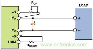 輸出電壓可通過改變連接電源模塊正輸出端或接地端的電阻來進行調(diào)節(jié)通過連接外部電阻RUP并使RDOWN浮空,可以向上調(diào)整輸出電壓(高于標稱輸出電壓),或者通過連接外部電阻RDOWN并使RUP短路(電阻值為零)向下調(diào)整(低于標稱輸出電壓)。
