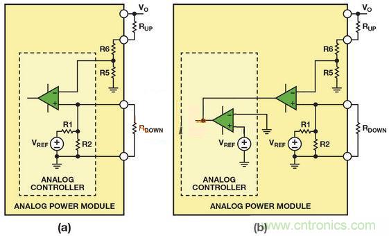 (b)帶有固定內(nèi)部基準電壓的模擬控制器調(diào)整模擬電源模塊的輸出電壓