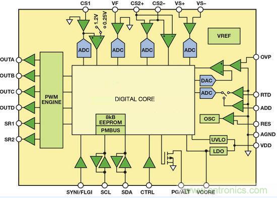 該器件非常適合高密度DC-DC電源轉(zhuǎn)換,具有6個可編程脈沖寬度調(diào)制(PWM)輸出,可控制大部分高效電源拓撲。另外,該器件還能控制同步整流(SR),并集成6個模數(shù)轉(zhuǎn)換器(ADC),能夠采樣模擬輸入電壓、輸入電流、輸出電壓、輸出電流、溫度以及其它參數(shù)。轉(zhuǎn)換為數(shù)據(jù)后,將這些信號發(fā)送至數(shù)字內(nèi)核模塊進行處理。該器件采用靈活的狀態(tài)機架構(gòu),以硬件實現(xiàn)全部功能,提供穩(wěn)定可靠的解決方案,但無法通過編程實現(xiàn)設(shè)計以外的功能。器件的全部功能--包括輸出電壓調(diào)整--均以數(shù)字方式處理。為了調(diào)整輸出電壓,應(yīng)通過PMBus接口發(fā)送一條命令,改變數(shù)字基準電壓值。