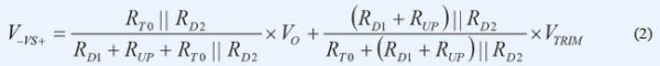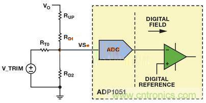 VS+引腳上的正常工作電壓為1V。若 VTRIM為1V左右且RT0遠大于RD2,則可忽略電路的其余分支部分。復合網(wǎng)絡(luò)用作簡單分壓器,并調(diào)節(jié)RUP電阻值,提供類似于模擬控制器的特性,實現(xiàn)了模擬電源模塊中的電壓向上調(diào)整。