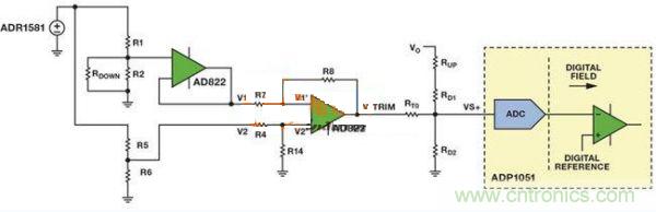 圖5中的電路具有兼容模擬向上或者向下調(diào)壓的功能兩個電阻分壓器產(chǎn)生兩個基準電壓,其中一個基準電壓表示模擬控制器所需的輸出基準電壓,另一個表示內(nèi)部基準電壓。利用一個電壓跟隨器來避免所需的輸出基準電壓與后續(xù)電路相互影響。利用AD822 FET輸入運算放大器,將所需的輸出基準電壓(V1)從模擬控制器的內(nèi)部基準電壓(V2)中去除,得到所需的電壓差。此電路的線性放大增益確保了VTRIM足夠大,從而能對VVS+產(chǎn)生影響。