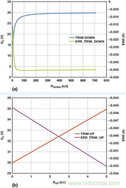 圖6:使用重新配置的反饋網(wǎng)絡(luò)后,調(diào)整ADP1051輸出電壓的計算結(jié)果:(a)向下調(diào)整 (b)向上調(diào)整