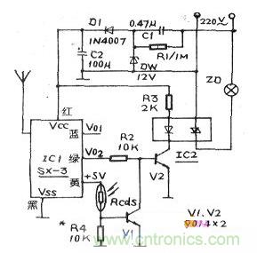 IC1是一只SX-3型人體接近開關(guān)集成電路模塊,該器件最大探測距離可達(dá)10米。其中紅線接正電源端,黑線接公共端,黃線為+5v電源輸出端,供外部使用,藍(lán)線為即時開關(guān)信號輸出端(本電路不用),綠線為具有時間累積功能的延時開關(guān)信號輸出端。220V市電由C1降壓、D1整流、C2濾波、DW穩(wěn)壓后為控制電路提供12V直流電源。平時,沒有人接近IC1或當(dāng)行人很快從報欄前經(jīng)過時,IC1的VO2端輸出低電平,后級電路不動作,燈不亮。當(dāng)有人要看報在報欄前停頓數(shù)秒后,IC1的V02端輸出高電平。白天時,光敏電阻Rcds為低阻值,V1導(dǎo)通,V2截止,后級電路仍不能工作。晚聞Rcds為高阻值,V1截止,的高電平使V2導(dǎo)通,光電耦合器IC2內(nèi)藏發(fā)光二極管發(fā)光,光敏可控硅開通,燈泡ZD發(fā)光。閱報者離開后,IC1V02端又變?yōu)榈碗娖?,ZD自動熄滅。