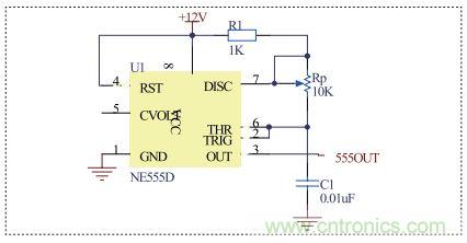 2.1.1 NE555D脈沖發(fā)生器模塊 如圖1,根據(jù) T =(R1+Rp)C1,f = 1/T,調(diào)節(jié)Rp使NE555D輸出一個(gè)36.7KHZ的脈沖頻率。