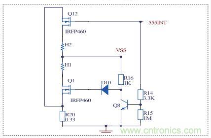 主要把NE555D產(chǎn)生的一個(gè)36.7KHZ的脈沖功率放大,經(jīng)發(fā)射線圈發(fā)射出去。當(dāng)脈沖為高電平時(shí),Q12柵極為高電平,Q12導(dǎo)通,此時(shí)Q8飽和,Uceq電壓只有0.67V,經(jīng)D10-4148后Q1柵極電壓為0,Q1截止。當(dāng)脈沖為低電平時(shí),Q8、Q12同時(shí)截止,電流直接由R16 D10 Q1,Q1導(dǎo)通。整個(gè)過(guò)程中Q1與Q12均以一開(kāi)一關(guān)的形式工作。電路如圖2: