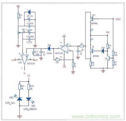 當(dāng)有感應(yīng)負(fù)載時(shí),R20(0.33歐)電阻上的電壓會(huì)增大,經(jīng)運(yùn)放U2A放大A=1+R5/R6=23倍后,電壓變化明顯,再經(jīng)過(guò)1N4148整流濾波,得電壓U1與基準(zhǔn)源Uo比較,此時(shí)U1>Uo,運(yùn)放輸出Ui為高電平,七彩燈閃爍;當(dāng)感應(yīng)負(fù)載充滿電(或沒(méi)有感應(yīng)到負(fù)載),此時(shí)U1<Uo,運(yùn)放輸出Ui為低電平,綠燈亮。