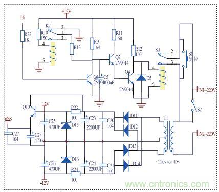 (1)當(dāng)開(kāi)關(guān)S2斷開(kāi)時(shí),整充電器處于智能充電過(guò)程。充電器啟動(dòng)時(shí),繼電器K1閉合,同時(shí)K2為斷開(kāi)狀態(tài)。當(dāng)有感應(yīng)負(fù)載時(shí),七彩燈閃爍,Ui為高電平,此時(shí)Q5飽和,電壓Uceq為0.67V,低于Q2+Q4的導(dǎo)通電壓之和(1.34V),Q2與Q4構(gòu)成達(dá)林頓,同時(shí)截止,繼器K1吸合;當(dāng)感應(yīng)負(fù)載充滿電(或無(wú)感應(yīng)負(fù)載)時(shí),綠燈亮,即Ui為低電平,此時(shí)Q3截止,電容C5與R9構(gòu)成RC充電電路,當(dāng)電容充電電壓到達(dá)Q2與Q4的導(dǎo)通電壓時(shí),Q2導(dǎo)通,使Q4飽和,此時(shí)繼電器工作電壓只有0.67V,繼電器斷開(kāi),整個(gè)電路處于完全斷電狀態(tài)。