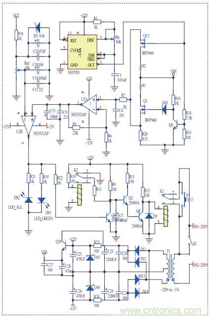 斷電后,繼電器K2閉合,此時(shí)C5與R13構(gòu)成RC放電電路,給C5快速放電。當(dāng)按一下輕觸復(fù)位開(kāi)關(guān)時(shí),充電器重新啟動(dòng)。當(dāng)感應(yīng)負(fù)載充滿電(或無(wú)感應(yīng)負(fù)載)時(shí),電容C5充電,其電壓為Ut 由公式Ut=12*(1-e-t/R9C5)得:t=-R9C5ln(1-Ut/12) 其中C5=100UF,R9=1MΩ,Ut=1.34V, 經(jīng)計(jì)算得斷電時(shí)間:t=10S 實(shí)現(xiàn)了10秒自動(dòng)斷電。在綠燈亮的10秒內(nèi)只要有感應(yīng)負(fù)載,則Ui為高電平,Q3飽和,電容C5放電。整個(gè)充電過(guò)程實(shí)現(xiàn)智能化斷電。