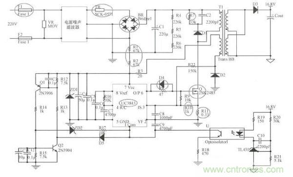 由于大部分電源故障發(fā)生在16.8 V前級輸出,故下文選取AC/DC模塊進(jìn)行分析,圖3為結(jié)合實物電路板逆向繪出的電路原理圖。結(jié)合本文上面內(nèi)容介紹,可以得出結(jié)論:本模塊采用了以UC3843芯片為核心的隔離型反激開關(guān)電源結(jié)構(gòu)。
