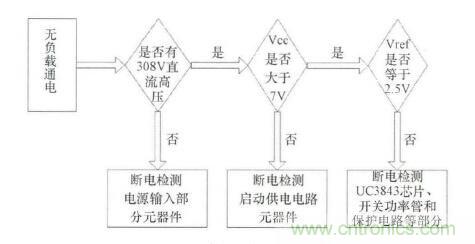 檢修電源首先要檢查在斷電狀態(tài)下有無明顯的短路、元器件損壞故障。打開電源的外殼,檢查保險絲是否熔斷,再觀察電源的內(nèi)部情況,如果發(fā)現(xiàn)電源部分的元件破裂,則應(yīng)重點檢査此元件,一般來講這是出現(xiàn)故障的主要原因,嗅一下電源內(nèi)部是否有糊味,檢查是否有燒焦的兀器件,問一下電源損壞的經(jīng)過,這一點對于維修任何設(shè)備都是必需的。在初步檢査以后,還要對電源進(jìn)行更深人的檢測,具體步驟可參考圖4。