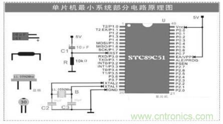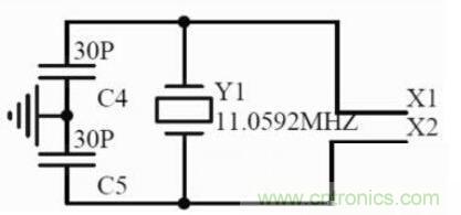 STC89C51使用11.0592MHz的晶體振蕩器作為振蕩源,由于單片機內(nèi)部帶有振蕩電路,所以外部只要連接一個晶振和兩個電容即可,電容容量一般在15pF至50pF之間。
