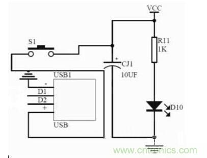 此最小系統(tǒng)中的電源供電模塊的電源可以通過計算機的USB口供給,也可使用外部穩(wěn)定的5V電源供電模塊供給。電源電路中接入了電源指示LED,圖中R11為LED的限流電阻。S1為電源開關(guān)。