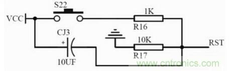 (2)按鍵復位:按鍵復位就是在復位電容上并聯(lián)一個開關(guān),當開關(guān)按下時電容被放電、RST也被拉到高電平,而且由于電容的充電,會保持一段時間的高電平來使單片機復位。