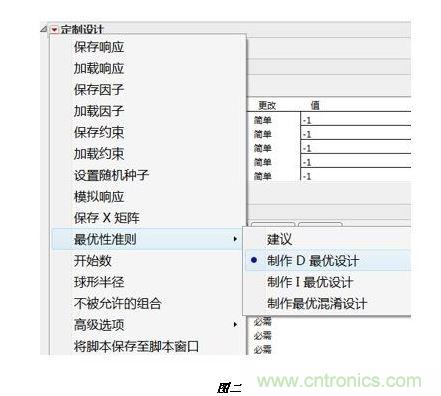 篩選設(shè)計(jì)是指在問題研究的早期,潛在的候選因素很多,如何有效地大規(guī)模降低實(shí)驗(yàn)次數(shù)而又準(zhǔn)確地找到少數(shù)幾個(gè)影響發(fā)動機(jī)性能的關(guān)鍵因素。具體的實(shí)現(xiàn)手段有兩種:一種是經(jīng)典的實(shí)驗(yàn)設(shè)計(jì)方法,如部分析因設(shè)計(jì)、Plackett-Burman設(shè)計(jì)等(如圖一所示);另一種是高級的實(shí)驗(yàn)設(shè)計(jì)方法,如D最優(yōu)設(shè)計(jì)等(如圖二所示)。