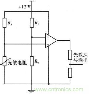 其由光電轉(zhuǎn)換模塊和光敏電阻組成。光電轉(zhuǎn)換由比較器來實(shí)現(xiàn)。當(dāng)光敏探頭感應(yīng)的光照強(qiáng)度不強(qiáng)時,比較器會輸出高電位,否則輸出低電位。具體電路如圖6所示。R1分擔(dān)電路電壓,依照外界環(huán)境條件,選擇適當(dāng)?shù)碾娮鑂2,控制比較器中正相輸入的電壓值,使其作為比較器工作的參考電壓;R3起到保護(hù)光敏電阻以及分壓的作用。光敏電阻的阻值隨著外界光強(qiáng)的變化而變化,這樣就可將光信號變換成電壓信號,以此作為信號電壓連接到比較器的反相輸入端。比較兩個輸入端的電壓大小。若信號電壓較小,比較器輸出高電平,否則比較器輸出低電平。從而實(shí)現(xiàn)在明亮條件下輸出低電平,在黑暗條件下輸出高電平的設(shè)計要求。