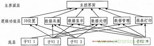 我們采用自頂向下的設計方式,將系統(tǒng)分為3層:主界面層、邏輯功能層和底層。“主界面層”主要包括主人機界面和系統(tǒng)總體控制。“邏輯功能層”負責系統(tǒng)的各種邏輯功能,例如I/O設置、數據采集、數據處理、數據管理和數據查詢等。“底層”則是一個個按照基本功能劃分子VI,供給高層次VI調用。采用調用子VI的形式來實現(xiàn)模塊之間的調用和關聯(lián)。當調用子VI時,系統(tǒng)需要花費很少的開銷,大概幾十毫秒的時間。測試系統(tǒng)的軟件層次結構圖3所示。
