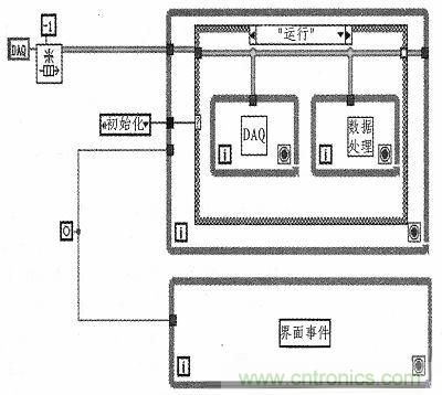 圖4是測試系統(tǒng)軟件的總體架構。其主要要點是:用while循環(huán)實現(xiàn)系統(tǒng)狀態(tài)機,用事件結構監(jiān)控界面按鈕事件(用戶點擊各種按鈕)和用戶自定義事件,上述2者用事件進行同步,在狀態(tài)機的“運行子狀態(tài)”中,用隊列同步數據采集和數據處理顯示。