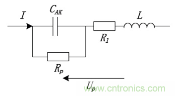 根據(jù)鋁電解電容的物理結構,可以用圖 1中所示的電路等效,其中CAK代表兩電極間的理想電容量;Rp 是并聯(lián)電阻,代表了電容的漏電流成分;Rl 代表了電容引出端及電極部分的串聯(lián)電阻成分;L 代表了引出線和連接處的等效串聯(lián)電感成分。