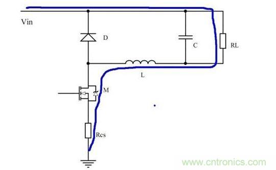 接下來(lái)的開(kāi)關(guān)周期內(nèi),電感通過(guò)二極管D續(xù)流,如圖3所示。這就出現(xiàn)了一個(gè)問(wèn)題,此時(shí)的電流不再流經(jīng)開(kāi)關(guān)管,控制電路無(wú)法知道電流下降到何種程度了。