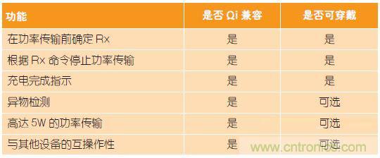 大多數(shù)Qi兼容功能的使用并不影響尺寸或性能。異物檢測(FOD)功能是一項可選功能,可防止功率傳輸?shù)匠潆妳^(qū)的雜散金屬物體。在具有FOD功能的低功耗系統(tǒng)中,總輸出功率被減小50%以上。隨著充電區(qū)域的縮小,物體進入該區(qū)域,并被加熱至出現(xiàn)問題的可能性也大大降低。FOD功能的關(guān)鍵可能主要取決于可穿戴設(shè)備充電墊或充電底座的機械設(shè)計。表1總結(jié)了采用WPC-1.1 Qi標準時的一些主要可用功能,而這些功能在定制可穿戴應(yīng)用時是可選的。