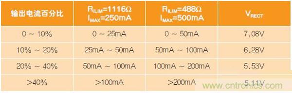 該器件系列具有動態(tài)整流器控制功能以改善負載瞬態(tài)特性(表2)。Qi標準有一個相對緩慢的全局反饋回路,最多可能需要100ms的時間來改變工作點。這意味著負載階躍會降低輸出電壓并引起系統(tǒng)復(fù)位。為了提供足夠的電壓應(yīng)對瞬態(tài)變化,在低負載時需要把VRECT工作點設(shè)高。該特性有助于負載階躍,但會降低輕載效率。為解決這個問題,用動態(tài)效率調(diào)節(jié)功能來調(diào)節(jié)輕載電壓,以適應(yīng)最大輸出負載。此外,還用一個電阻器來設(shè)定最大輸出電流。