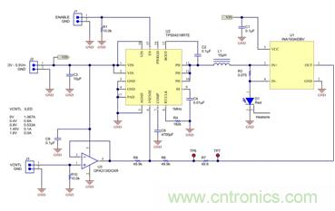 圖1顯示的是一個通過高側(cè)感測電阻器R3直接驅(qū)動LED中電流的降壓轉(zhuǎn)換器,TPS54218,同步降壓控制器。這個電流感測電壓被電流感測監(jiān)視器,INA193,放大20倍,這樣可顯著地降低R3中的功率耗散并提升效率。分流監(jiān)視器的電流反饋信號輸出給電阻分壓器 (R6/R8),這形成了到VSENSE的完整反饋路徑。