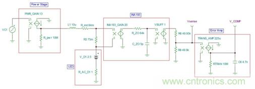 圖2是仿真控制回路的圖1的簡單SPICE模型。VC1是COMP引腳上的電壓,直接驅(qū)動跨導(dǎo)增益為13的功率級(控制器更多的內(nèi)部細(xì)節(jié)請參見TPS54218數(shù)據(jù)表內(nèi)的圖31)。這個電流通過電感器和感測電阻器來直接驅(qū)動LED。需要注意的是,電感值和LED值的變化不會對響應(yīng)產(chǎn)生影響,這是因為電感器中的電流受到了控制。