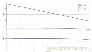 外部補(bǔ)償組件C6從這個點 (V_COMP) 上接地。需要注意的是,V_COMP也是我們回路仿真的起始點 (VC1)。回路增益是V_COMP引腳上測得的電壓除以VC1上的注入擾動。所以,通過將VC1設(shè)定為1 Vac信號,回路增益最終就是V_COMP上測得的電壓。