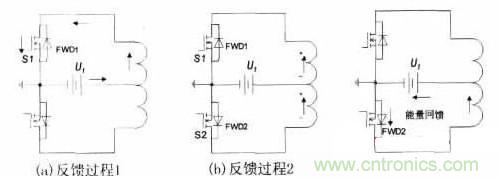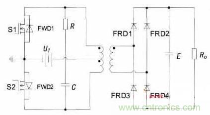 當(dāng)S1開通時(shí),其漏源電壓uDS1只是一個(gè)開關(guān)管的導(dǎo)通壓降,在理想情況下可假定uDS1=0,而此時(shí)由于在繞組中會(huì)產(chǎn)生一個(gè)感應(yīng)電壓,并且根據(jù)變壓器初級(jí)繞組的同名端關(guān)系,該感應(yīng)電壓也會(huì)疊加到關(guān)斷的S2上,從而使S2在關(guān)斷時(shí)承受的電壓是輸入電壓與感應(yīng)電壓之和約為2UI.在實(shí)際中,變壓器的漏感會(huì)產(chǎn)生很大的尖峰電壓加在S2兩端,從而引起大的關(guān)斷損耗,變換器的效率因受變壓器漏感的限制,不是很高。在S1和S2的漏極之間接上RC緩沖電路,也稱為吸收電路,用來(lái)抑制尖峰電壓的產(chǎn)生。并且為了給能量回饋提供反饋回路,在S1和S2兩端都反并聯(lián)上續(xù)流二極管FWD.