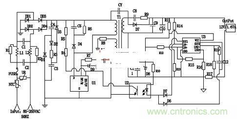 電源的核心部分采用反激式變換器,結(jié)構(gòu)簡單,易于實(shí)現(xiàn)。整體設(shè)計(jì)電路圖如圖1.